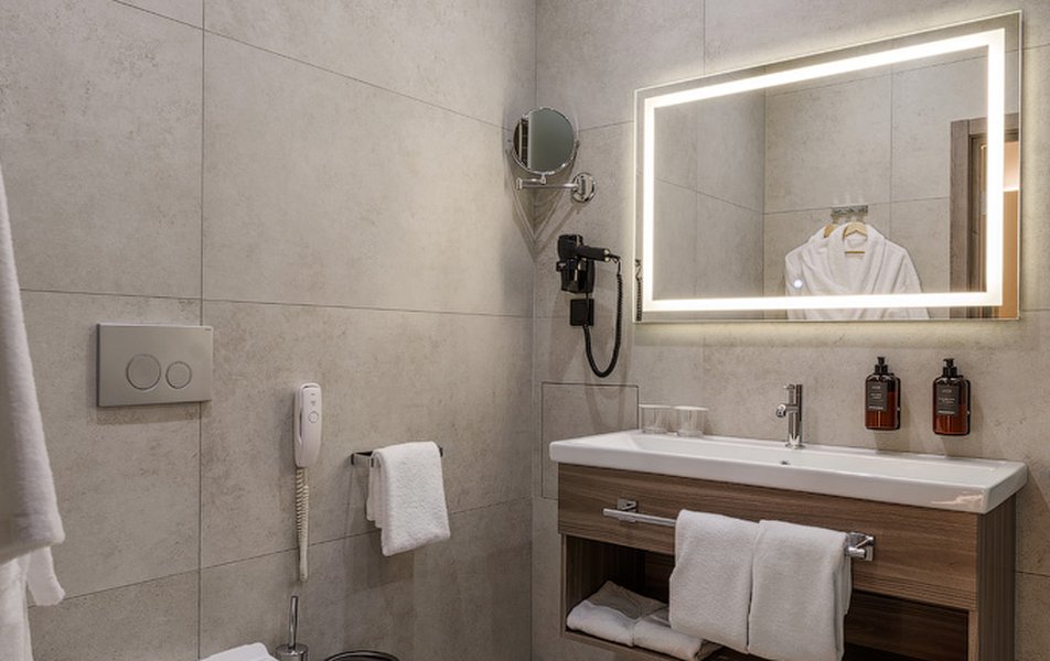 В номере: вешалка, зеркало, кровать двуспальная, прикроватная тумбочка, стол, тумба багажная, шкаф, мини-холодильник, сейф, телевизор ЖК, телефон, чайный набор посуды, электрочайник