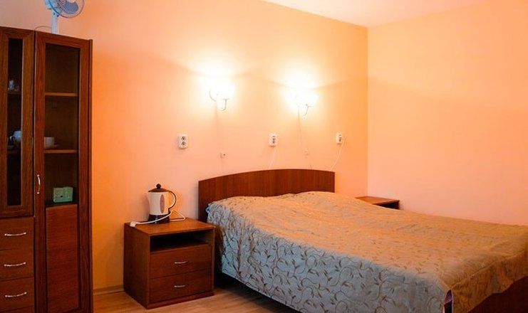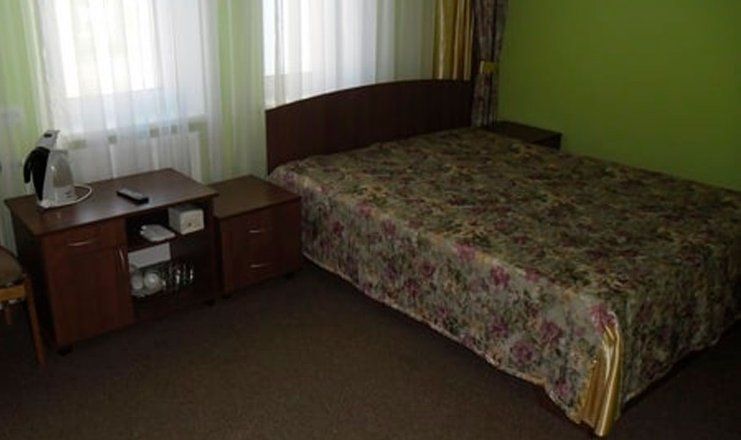 В номере: кровать двуспальная, прикроватные тумбочки, шкаф, мягкая мебель, телевизор, холодильник, чайный набор посуды
