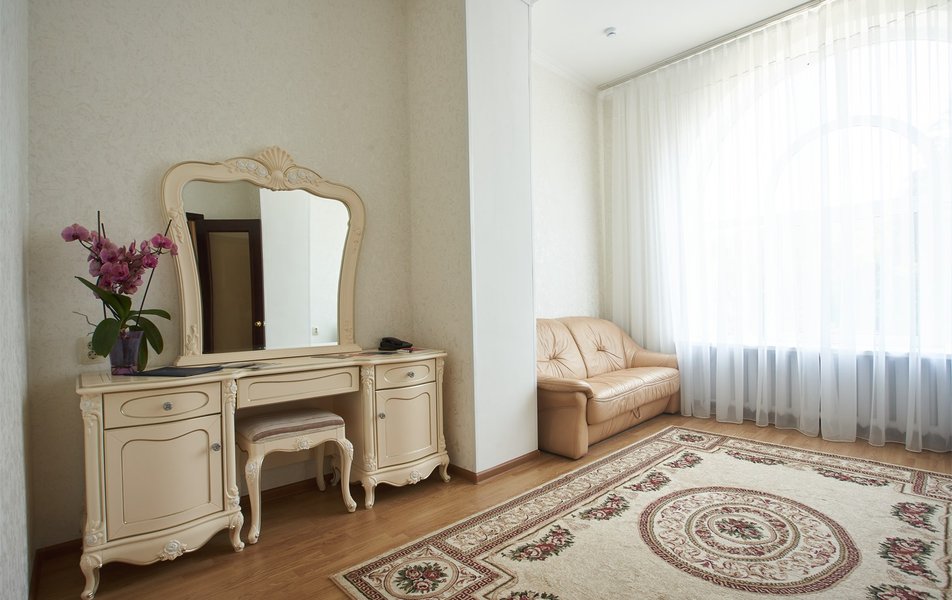 В номере: вешалка, зеркало, кресло, диван, кровати односпальные /одна двуспальная кровать, прикроватные тумбочки, стол, столик журнальный, шкаф, телевизор, телефон, холодильник, чайный набор посуды, электрочайник