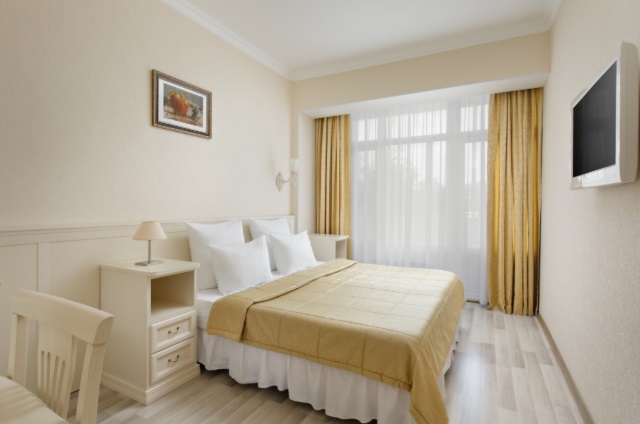 В номере: полутораспальная кровать, тумбы прикроватные, стол, стулья, телевизор, холодильник, сейф, электрический чайник