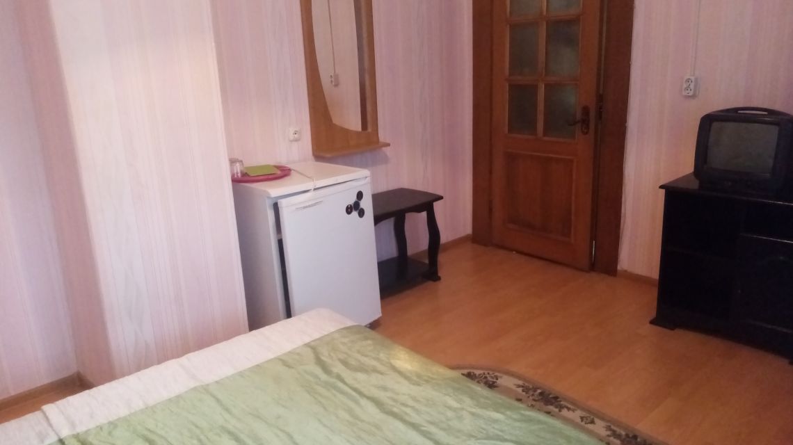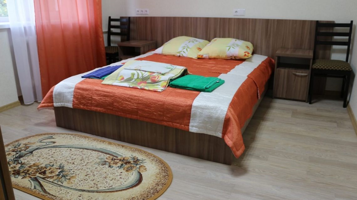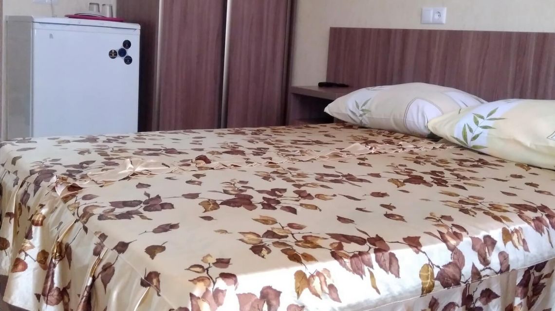 В номере: двуспальная кровать, прикроватные тумбы, стул, стол журнальный, шкаф, холодильник, телевизор, набор посуды