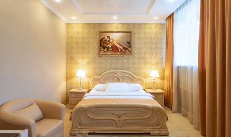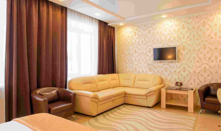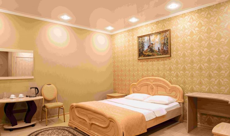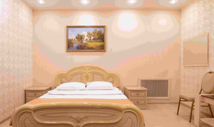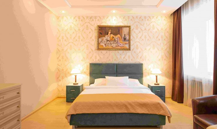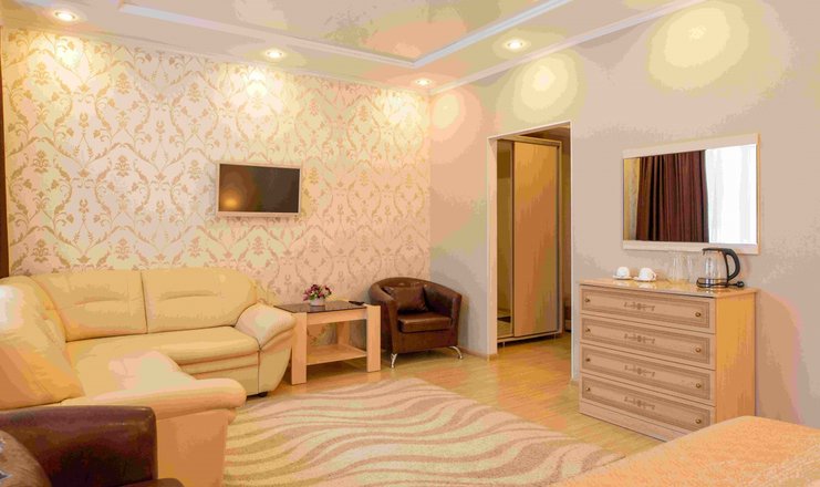 В номере: вешалка, диван раскладной, зеркало, кровать двуспальная, прикроватные тумбочки, стол, стулья, шкаф, телевизор, телефон, холодильник, чайный набор посуды, электрочайник