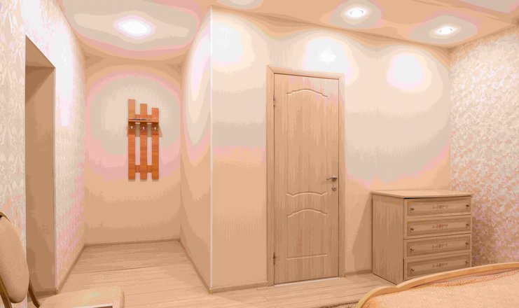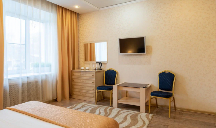 В номере: вешалка, зеркало, кровать двуспальная, прикроватные тумбочки, стол, стулья, шкаф, гладильная доска, телевизор, холодильник, чайник